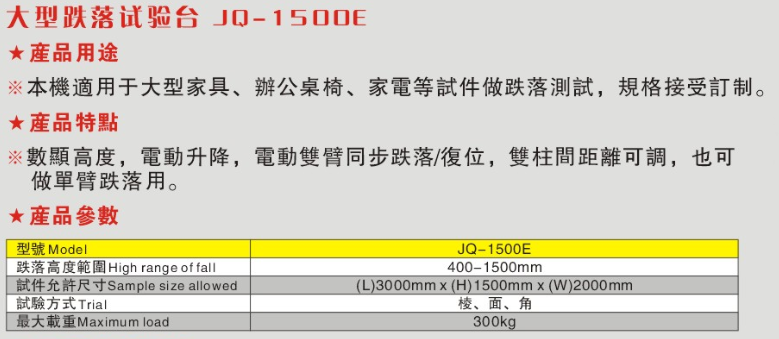 產(chǎn)品型號:JQ-1500E 品牌:劍 喬 用途:大型雙臂跌落試驗機 該系列跌落試驗臺主要用于模擬包裝件在運輸、裝卸過程中受跌落沖擊的影響程度鑒定包裝件的耐沖擊強度及包裝設(shè)計的合理性。通過自由跌落對運輸包裝件進行垂