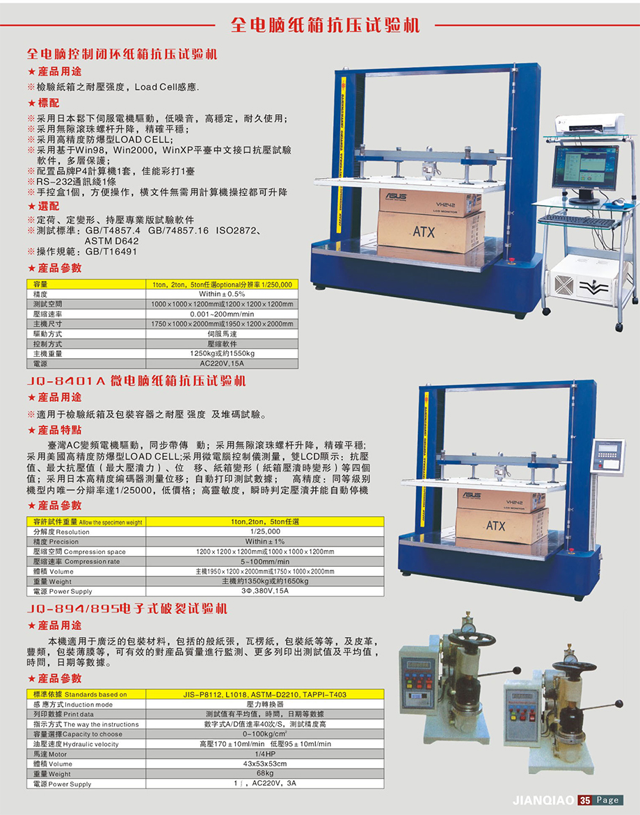 產品型號:JQ-8401 品牌:劍 喬 用途:全智能電腦控制紙箱耐壓測試儀/整箱抗壓試驗機/空箱抗壓強度測試儀是一款多功能標準型紙箱質量檢驗設備,主要用于各類中等常規(guī)尺寸瓦楞紙箱的抗壓強度試驗或其他材料制成的抗壓強度小