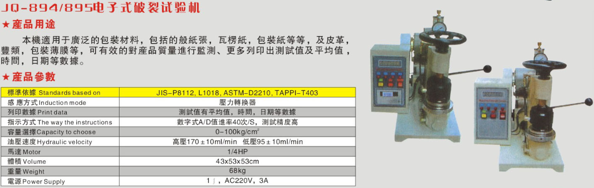本儀器之設(shè)計(jì)符合ISO2759《紙板耐破度的測(cè)定》和GB/T1539《紙板的測(cè)定法》之標(biāo)準(zhǔn)要求。適用于以瓦楞紙包裝之制鞋、電子、電線、電器、五金、自行車、手提包、食品、家具等工廠,檢驗(yàn)紙箱之抗破裂強(qiáng)度。亦可測(cè)試成皮﹑布類。采用訊號(hào)傳輸壓力,試料破裂時(shí)自動(dòng)保留最大破裂強(qiáng)度值。