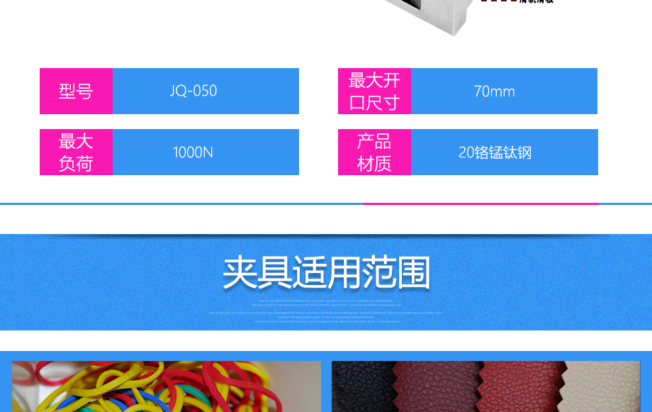 產(chǎn)品型號(hào):JQ-050 品牌:劍 喬 用途:平口鉗夾具適用范圍:橡膠、各種線纜、紙、各種電器元件、塑料薄膜等材料的拉力,破壞力測試。