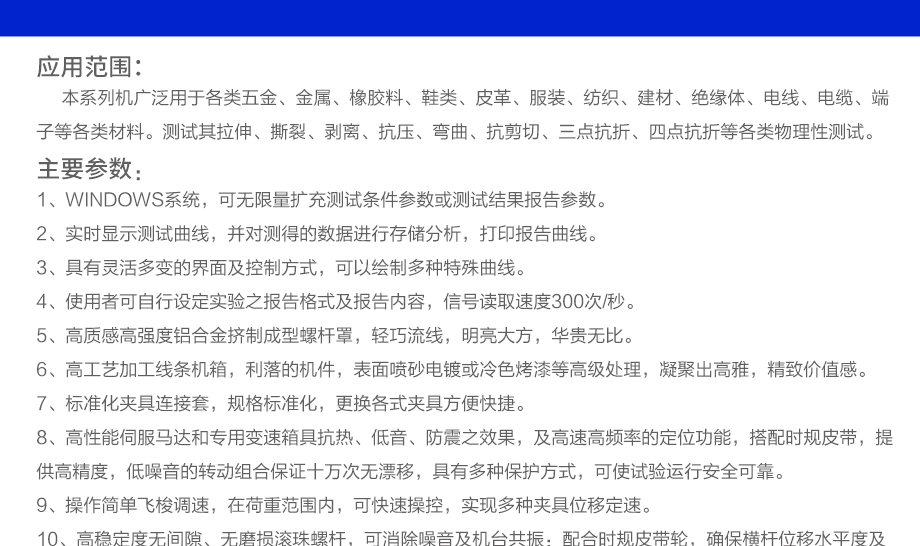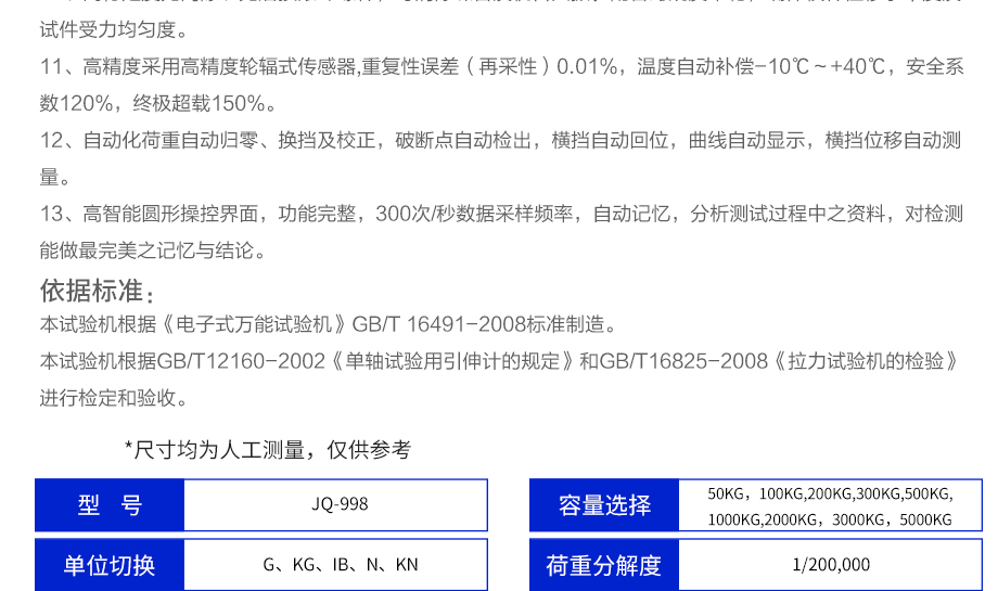 產(chǎn)品型號(hào):JQ-998(高端定制款) 品牌:劍 喬 用途:高端雙柱拉力機(jī)主要測(cè)試原物料、成品、半成品的物理特性,可做抗拉力測(cè)試、抗壓力測(cè)試、抗彎測(cè)試,取得伸長量、伸長率、應(yīng)力、應(yīng)變等測(cè)試結(jié)果及測(cè)試資料。
